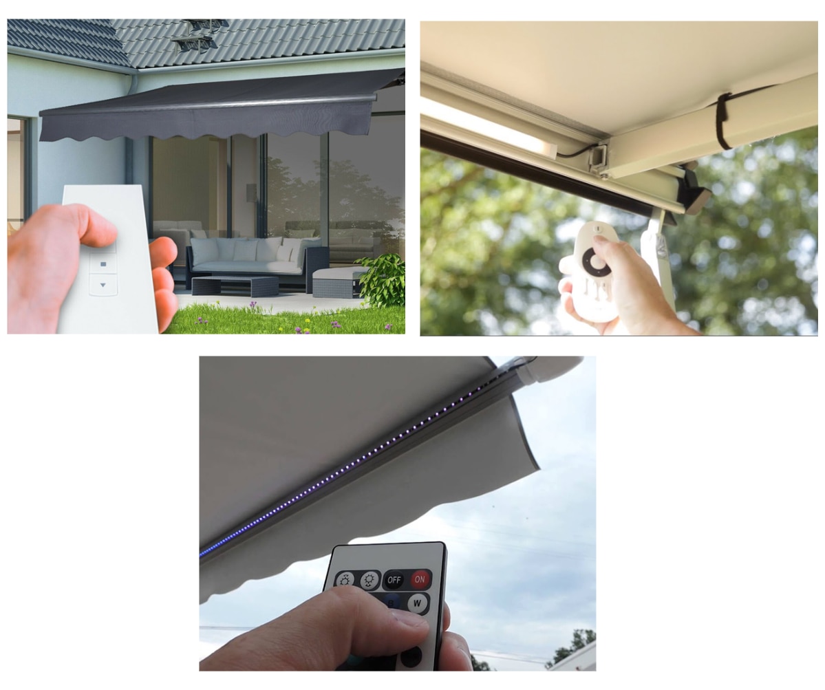 Motorized awnings can be opened and closed from anywhere using a remote control or smartphone.